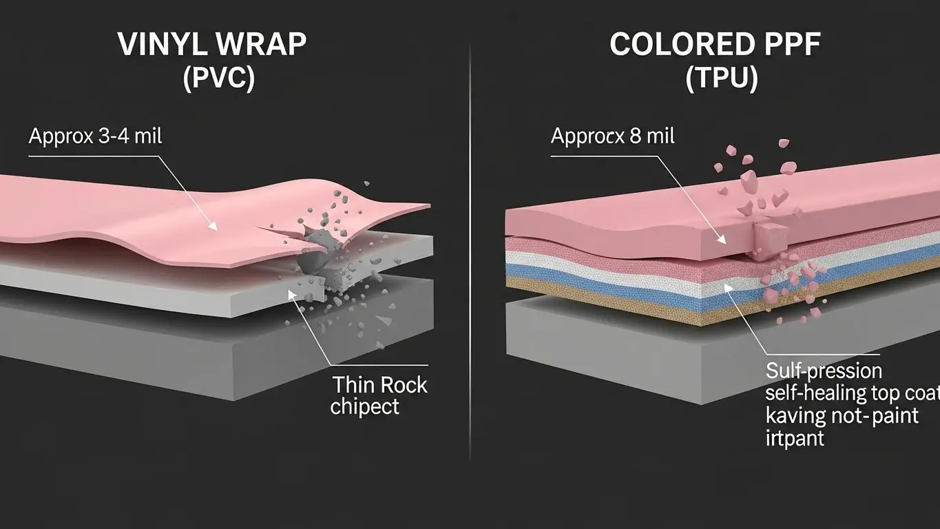 Colored PPF offers superior protection and longevity (7-10 years) with self-healing TPU technology that prevents rock chips, while Vinyl Wrap is a thinner, aesthetic-only solution that lasts 3-5 years. While Vinyl is 30-40% cheaper upfront, Colored PPF mimics real paint without "orange peel" and protects your vehicle's resale value, making it the better long-term investment for 2026.